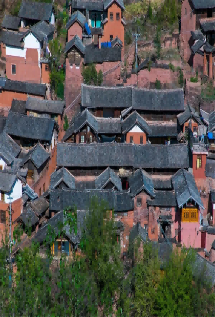 諾鄧古村歷史悠久,保留著大量明清兩朝的建筑,山頂?shù)挠窕书w,始建于明嘉靖年間,是現(xiàn)存罕見的三層閣樓式古建筑。大殿頂?shù)亩诵撬迗D,更為諾鄧一絕。